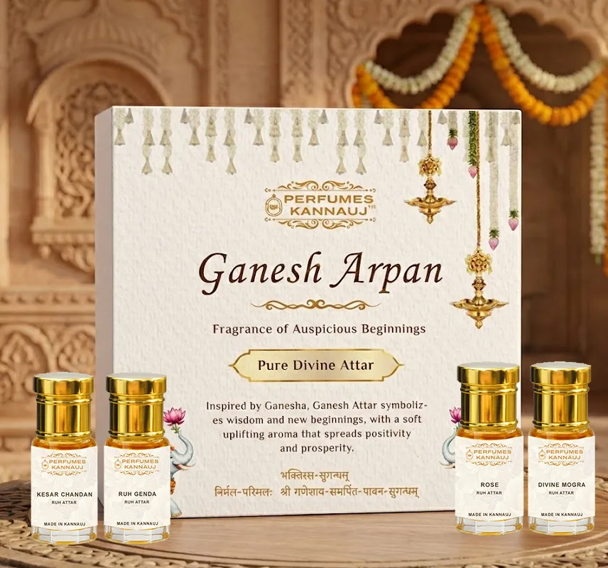 Ganesh Arpan Attar is a sacred blend of Kesar Chandan, Mogra, Genda, and Rose, symbolizing blessings and auspicious beginnings. Crafted in Kannauj, this alcohol-free fragrance creates a divine and uplifting aura perfect for pooja and spiritual moments.