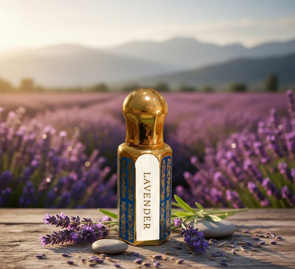 Pure lavender flower attar crafted in Kannauj using traditional distillation. Alcohol-free, soothing, and long-lasting natural perfume oil for daily use.